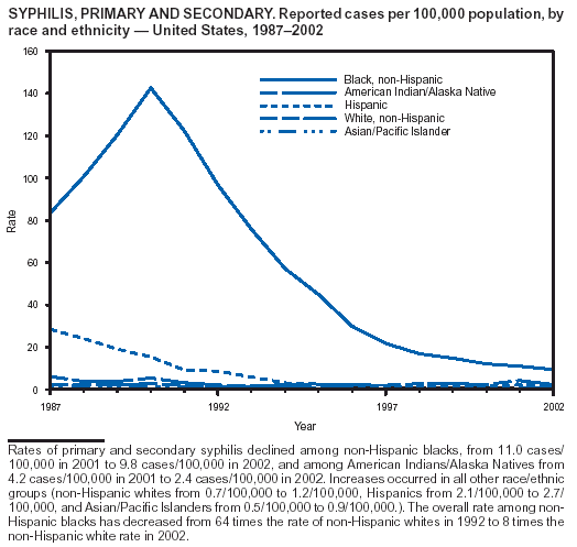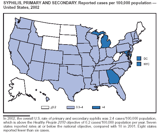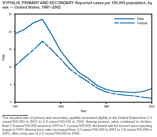 CDC. Primary and secondary syphilis among men who have sex with men---New York City, 2001. MMWR 2002;51:853--6.