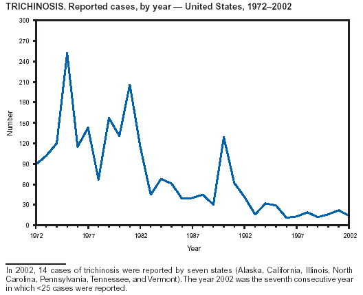 Moorhead A, Grunenwald PE, Dietz VJ, Schantz PM. Trichinellosis in the United States, 1991--1996: declining but not