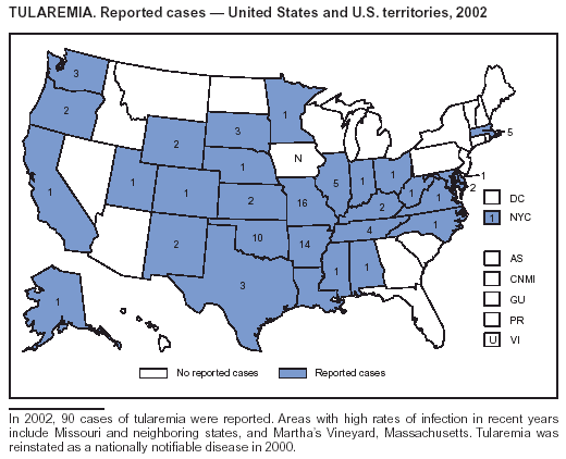 Feldman KA, Enscore RE, Lathrop SL, et al. Outbreak of primary pneumonic tularemia on Martha's Vineyard. N Engl J