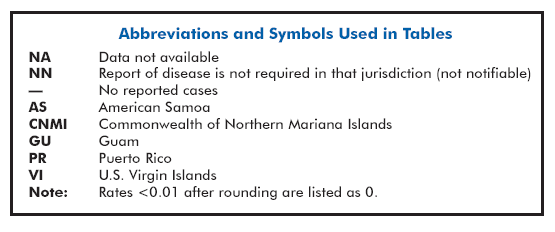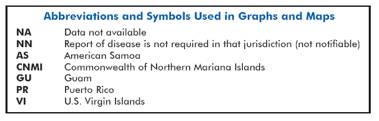 Disease totals for the United States, unless otherwise stated, do not include data for American Samoa, Guam, Puerto Rico, the U.S. Virgin Islands, or the Commonwealth of the Northern Mariana Islands.