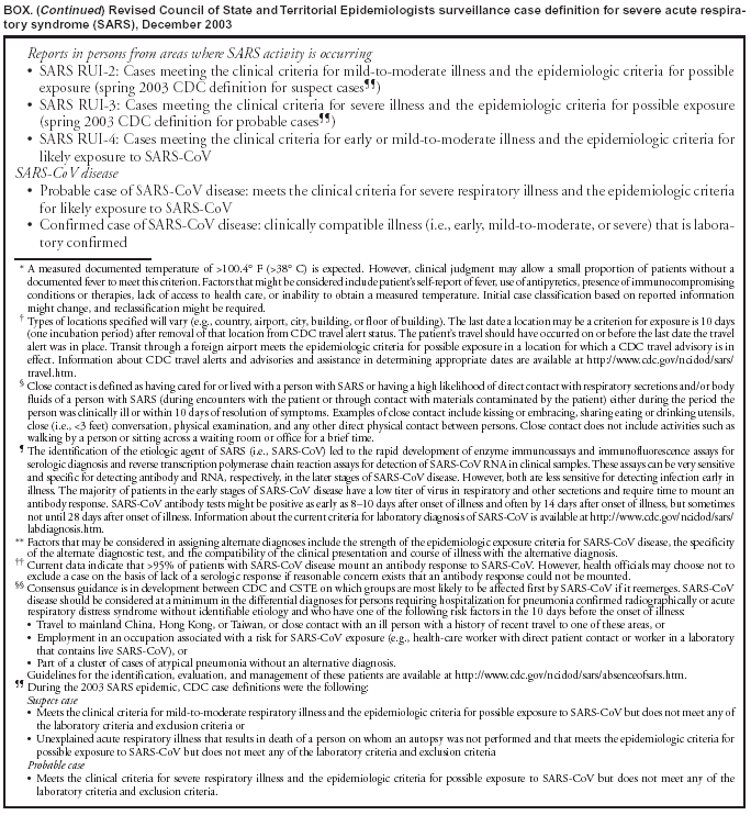 Persons using assistive technology might not be able to fully access information in this file. For assistance, please send e-mail to: mmwrq@cdc.gov. Type 508 Accommodation and the title of the report in the subject line of e-mail. Revised U.S. Surveillance Case Definition for Severe Acute Respiratory Syndrome (SARS) and Update on SARS Cases --- United States and Worldwide, December 2003During the 2003 epidemic of severe acute respiratory syndrome (SARS), CDC and the Council of State and Territorial Epidemiologists (CSTE) developed surveillance criteria to identify persons with SARS. The surveillance case definition changed throughout the epidemic as understanding of the clinical, laboratory, and transmission characteristics of SARS-associated coronavirus (SARS-CoV) increased (1--5). On June 26, CSTE adopted a position statement to add SARS-CoV disease to the National Notifiable Disease Surveillance System (NNDSS). The position statement included criteria for defining a SARS case for national reporting. On November 3, CSTE issued a new interim position statement* with a revised SARS case definition. This report summarizes the new U.S. surveillance case definition for SARS and updates reported cases of SARS worldwide and in the United States. Summary of Changes to Case DefinitionThe revised SARS case definition (Box) modifies the clinical, epidemiologic, laboratory, and case-exclusion criteria in the U.S. surveillance case definition used during the 2003 epidemic. In the clinical criteria, "early" illness replaces "asymptomatic" or "mild" illness. The epidemiologic criteria include the following new categories: 1) possible exposure to SARS-CoV and 2) likely exposure to SARS-CoV. Laboratory criteria for evidence of SARS-CoV infection reflect advances in testing technology. The case-exclusion criteria have been changed to allow for exclusion when a serum sample collected >28 days after onset of symptoms is negative for antibody to SARS-CoV. The revised case definition also classifies each SARS case as either a SARS report under investigation (SARS RUI) or SARS-CoV disease. SARS RUI is a sensitive, nonspecific case classification based solely on clinical or epidemiologic criteria and includes cases classified previously as probable or suspect. SARS-CoV disease is a more specific case classification based on selected clinical and epidemiologic criteria or laboratory confirmation. SARS RUIs might subsequently meet the definition for SARS-CoV disease based on results from laboratory testing (Tables 1 and 2). Update on SARS CasesDuring November 2002--July 2003, a total of 8,098 probable SARS cases were reported to the World Health Organization (WHO) from 29 countries, including 29 cases from the United States; 774 SARS-related deaths (case-fatality rate: 9.6%) were reported, none of which occurred in the United States (6). Eight U.S. cases had serologic evidence of SARS-CoV infection; these eight cases have been described previously (7--10). A total of 156 reported U.S. SARS cases from the 2003 epidemic remain under investigation, with 137 (88%) cases classified according to previous surveillance criteria as suspect SARS and 19 (12%) classified as probable SARS. Because convalescent serum specimens have not been obtained from the 19 probable and 137 suspect cases that remain under investigation, whether these persons had SARS-CoV disease is unknown. Reported by: SARS Team and Executive Committee, Council of State and Territorial Epidemiologists. SARS Investigative Team, CDC. Editorial Note:The revised surveillance case definition for SARS reflects an improved understanding of the clinical and laboratory characteristics of SARS-CoV. The revision differentiates patients with nonspecific clinical illness or less definitive epidemiologic associations (i.e., SARS RUIs) from those with laboratory-confirmed SARS-CoV infection or more definitive epidemiologic links (i.e., cases of SARS-CoV disease). Local and state health departments will monitor SARS RUIs to ensure implementation of prompt public health measures for preventing disease transmission if SARS-CoV is confirmed subsequently. Numerous SARS RUIs probably will be excluded as SARS cases as laboratory results become available during the course of illness. Surveillance data for cases meeting the SARS-CoV disease case definition will be reported to NNDSS and included in the weekly statistical summary of notifiable infectious diseases in the United States published in MMWR (Table 1. Summary of provisional cases of selected notifiable diseases, United States). Reporting of cases meeting previous SARS definitions ended in late July 2003. However, case numbers continue to change as new clinical information or results of additional laboratory testing on cases reported previously become available. Updated case counts reflecting these changes are available from CDC at http://www.cdc.gov/od/oc/media/sars/cases.htm. Efforts are under way to prepare for a possible reappearance of SARS-CoV. CDC, in collaboration with other federal partners, state and local health officials, professional organizations and societies, and representatives of the health-care industry, has developed a guidance document to help public health and health-care officials detect the reappearance of SARS-CoV in the United States quickly and implement a decisive and effective public health response. The document, "Public Health Guidance for Community-Level Preparedness and Response to Severe Acute Respiratory Syndrome (SARS)," is available at http://www.cdc.gov/ncidod/sars/sarsprepplan.htm. References