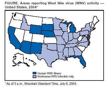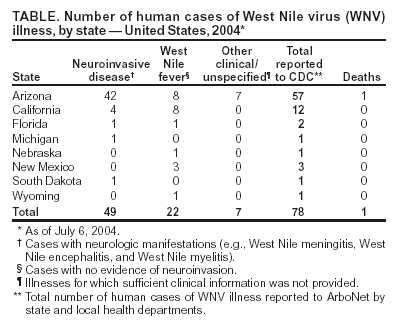 Persons using assistive technology might not be able to fully access information in this file. For assistance, please send e-mail to: mmwrq@cdc.gov. Type 508 Accommodation and the title of the report in the subject line of e-mail. West Nile Virus Activity --- United States, June 30--July 6, 2004During June 30--July 6, a total of 21 human cases of West Nile virus (WNV) illness were reported from two states (Arizona and California). During 2004, eight states have reported a total of 78 human cases of WNV illness to CDC through ArboNET (Table, Figure). Of these, 57 (73%) were reported from Arizona. Forty-seven (61%) of the 78 cases occurred in males; the median age of patients was 53 years (range: 1--84 years); the dates of illness onset ranged from April 23 to June 28; and one case was fatal. A total of 20 presumptive West Nile viremic blood donors (PVDs) have been reported to ArboNET. Of these, 19 were reported from Arizona, and one was reported from New Mexico. Of the 20 PVDs reported to ArboNET, one person aged 69 years subsequently had neuroinvasive illness, and four persons aged 22, 51, 52, and 57 years subsequently had West Nile fever. In New Mexico, the first reported human WNV infection in 2004 was in a PVD; in Arizona, three of the first seven reported human WNV infections of 2004 were in PVDs. In addition, during 2004, a total of 861 dead corvids and 86 other dead birds with WNV infection have been reported from 24 states, and 42 WNV infections in horses have been reported from 11 states (Alabama, Arizona, California, Idaho, Missouri, North Carolina, Oklahoma, South Dakota, Tennessee, Texas, and Virginia). WNV seroconversions have been reported in 110 sentinel chicken flocks from four states (Arizona, California, Florida, and Louisiana). Three seropositive sentinel horses were reported from Puerto Rico. A total of 226 WNV-positive mosquito pools have been reported from 12 states (Arizona, California, Illinois, Indiana, Louisiana, Michigan, Missouri, New Jersey, Ohio, Pennsylvania, Texas, and Virginia). Additional information about national WNV activity is available from CDC at http://www.cdc.gov/ncidod/dvbid/westnile/index.htm and at http://westnilemaps.usgs.gov. TableFigure