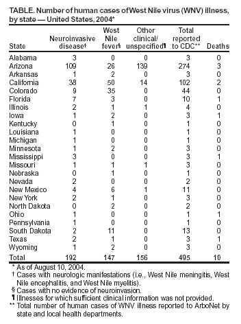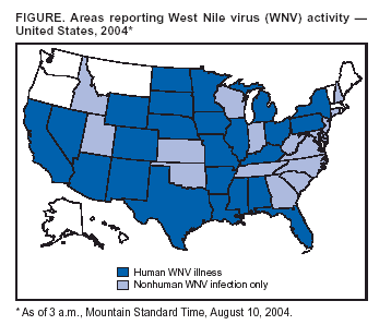 Persons using assistive technology might not be able to fully access information in this file. For assistance, please send e-mail to: mmwrq@cdc.gov. Type 508 Accommodation and the title of the report in the subject line of e-mail. West Nile Virus Activity --- United States, August 4--10, 2004During August 4--10, a total of 89 cases of human West Nile virus (WNV) illness were reported from 14 states (Alabama, Arizona, California, Florida, Illinois, Kentucky, Louisiana, Minnesota, Mississippi, Missouri, New Mexico, North Dakota, South Dakota, and Wyoming). During 2004, a total of 24 states have reported a total of 495 cases of human WNV illness to CDC through ArboNET (Table, Figure). Of these, 274 (55%) cases were reported from Arizona. A total of 281 (58%) of the 495 cases occurred in males; the median age of patients was 51 years (range: 1 month--99 years). Illness onset ranged from April 20 to August 3; 10 cases were fatal. A total of 46 presumptive West Nile viremic blood donors (PVDs) have been reported to ArboNET in 2004. Of these, 33 (72%) were reported from Arizona, seven from California, three from South Dakota, and one each from Colorado, Iowa, and New Mexico. Of the 46 PVDs, two persons aged 66 and 69 years subsequently had neuroinvasive illness, and seven persons (median age: 55 years; range: 22--72 years) subsequently had West Nile fever. In addition, during 2004, a total of 2,171 dead corvids and 342 other dead birds with WNV infection have been reported from 35 states. WNV infections have been reported in horses from 24 states (Alabama, Arizona, Arkansas, California, Colorado, Florida, Idaho, Illinois, Iowa, Kentucky, Minnesota, Mississippi, Missouri, Nevada, New Mexico, North Carolina, Ohio, Oklahoma, South Dakota, Tennessee, Texas, Virginia, Wisconsin, and Wyoming) and in a dog from New Mexico. Two unidentified animal species with WNV infection were reported from Illinois and Nevada. WNV seroconversions have been reported in 336 sentinel chicken flocks from seven states (Arizona, California, Delaware, Florida, Louisiana, Nebraska, and Nevada) and in two wild hatchling birds from Ohio. Three seropositive sentinel horses were reported from Puerto Rico. A total of 2,216 WNV-positive mosquito pools have been reported from 27 states (Arizona, Arkansas, California, Colorado, Connecticut, Georgia, Illinois, Indiana, Kansas, Kentucky, Louisiana, Maryland, Michigan, Mississippi, Missouri, Nebraska, Nevada, New Jersey, New Mexico, New York, Ohio, Pennsylvania, South Dakota, Tennessee, Texas, Utah, and Virginia). Additional information about national WNV activity is available from CDC at http://www.cdc.gov/ncidod/dvbid/westnile/index.htm and at http://westnilemaps.usgs.gov.