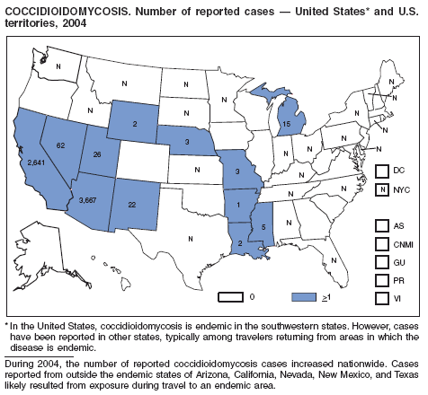 During 2003--2004, the number of reported cases of coccidioidomycosis increased 32% (1). The majority of these cases occurred in California and Arizona. Increases are probably attributable to recent changes in land use, demographics, and climate in endemic areas, although certain cases might be attributable to increased physician awareness and testing. New efforts are needed to determine the amount of undertesting by health-care providers so as to accurately define the burden of disease.