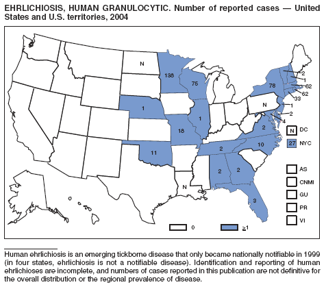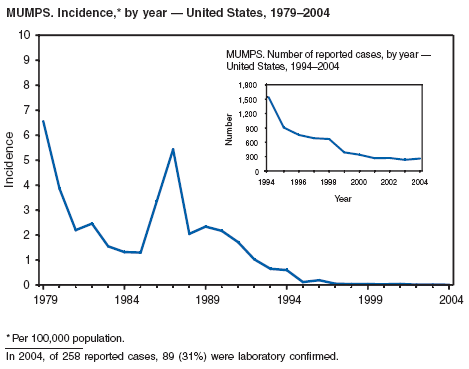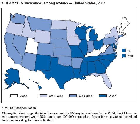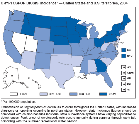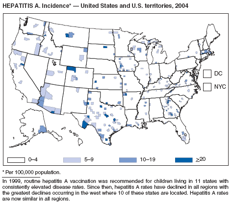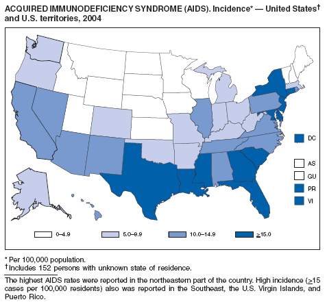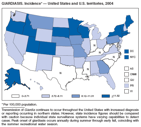 Population estimates for the states are derived from NCHS estimates of the July 1, 2000--July 1, 2003, U.S. resident population from the Vintage 2003 postcensal series by year, county, age, sex, race, and Hispanic origin, prepared under a collaborative arrangement with the U.S. Census Bureau (available at http://www.cdc.gov/nchs/about/major/dvs/popbridge/popbridge.htm). Population numbers for territories are 2003 estimates from the U.S. Census Bureau International Data Base Data Access--Display Mode (available at http://www.census.gov/main/ipc/www/idbprint.html). The choice of population denominators for incidence reported in the MMWR is based on 1) the availability of census population data at the time of preparation for publication and 2) the desire for consistent use of the same population data to compute incidence reported by different CDC programs. Incidence in the Summary is calculated as the number of reported cases for each disease or condition divided by either the U.S. resident population for the specified demographic population or the total U.S. residential population, multiplied by 100,000. When a nationally notifiable disease is associated with a specific age restriction, the same age restriction is applied to the population in the denominator of the incidence calculation. In addition, population data from states in which the disease or condition was not notifiable or was not available were excluded from incidence calculations. Unless otherwise stated, disease totals for the United States do not include data for American Samoa, Guam, Puerto Rico, the U.S. Virgin Islands, or the Commonwealth of the Northern Mariana Islands.