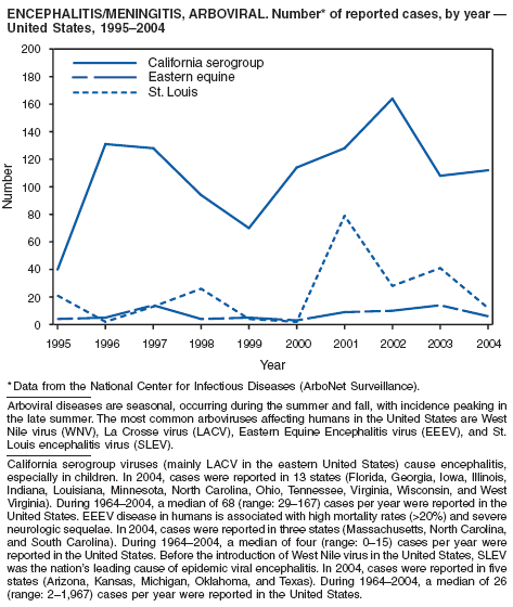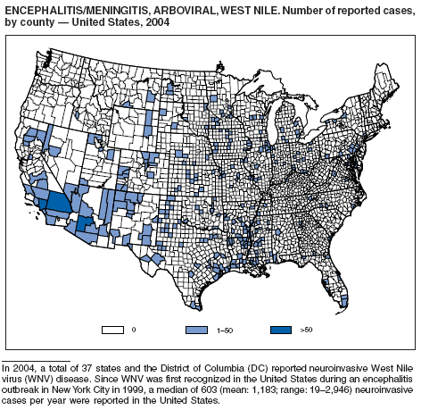 During 2004, for the sixth consecutive year, epidemic and epizootic West Nile virus (WNV) activity occurred in the United States (1), particularly in California, Arizona, and Colorado. A high incidence of neuroinvasive WNV disease continued to occur in the Midwest and Great Plains states. Other states experienced perennial reemergence in areas of previous activity, and continued geographic expansion into counties of Western states.