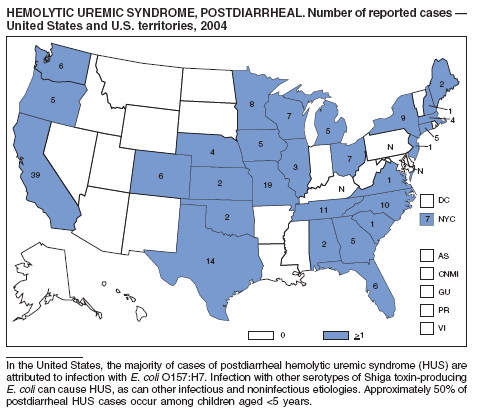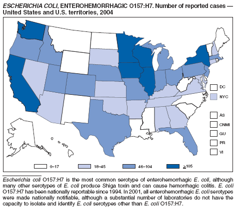 During 2004, cases of enterohemorrhagic E. coli were reported from 50 states, the District of Columbia, and Puerto Rico. Of these, 80% were classified as EHEC O157:H7; 10% as EHEC, serogroup non-O157; and 10% as EHEC, not serogrouped.