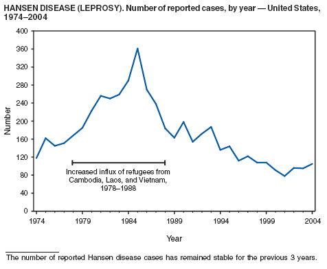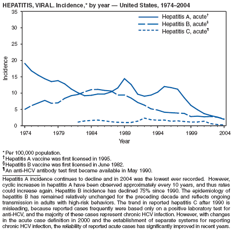PrefaceThe Summary of Notifiable Diseases --- United States, 2004 contains the official statistics, in tabular and graphic form, for the reported occurrence of nationally notifiable infectious diseases in the United States for 2004. Unless otherwise noted, the data are final totals for 2004 reported as of December 2, 2005. These statistics are collected and compiled from reports sent by state health departments to the National Notifiable Diseases Surveillance System (NNDSS), which is operated by CDC in collaboration with the Council of State and Territorial Epidemiologists (CSTE). The Summary is available at http://www.cdc.gov/mmwr/summary.html. This site also includes publications from previous years. The Highlights section presents noteworthy epidemiologic and prevention information for 2004 for selected diseases and additional information to aid in the interpretation of surveillance and disease-trend data. Part 1 contains tables showing incidence data for the nationally notifiable diseases during 2004.* The tables provide the number of cases reported to CDC for 2004 nationwide as well as the distribution of cases by geographic location and the patient's demographic characteristics (age, sex, race, and ethnicity). Part 2 contains graphs and maps that depict summary data for certain notifiable diseases described in tabular form in Part 1. The Selected Reading section presents general and disease-specific references for notifiable infectious diseases. These references provide additional information on surveillance and epidemiologic concerns, diagnostic concerns, and disease-control activities. Comments and suggestions from readers are welcome. To increase the usefulness of future editions, comments about the current report and descriptions about how information is or could be used are invited. Comments should be sent to Public Health Surveillance Team --- NNDSS, National Center for Public Health Informatics at soib@cdc.gov. * Because no cases of anthrax; diphtheria; influenza-associated pediatric mortality; paralytic poliomyelitis; rubella, congenital syndrome; severe acute respiratory syndrome--associated coronavirus (SARS-CoV) disease; smallpox; vancomycin-intermediate Staphylococcus aureus; western equine encephalitis; or yellow fever were reported in the United States during 2004, these diseases do not appear in the tables in Part 1. For certain other nationally notifiable diseases, incidence data were reported to CDC but are not included in the tables or graphs of this Summary. Data on chronic hepatitis B and hepatitis C virus infection (past or present) are undergoing data quality review. Data on ehrlichiosis attributable to other or unspecified agents are being withheld from publication pending the outcome of discussions about the reclassification of certain Ehrlichia species, which will probably affect how data in this category are reported. Data on human immunodeficiency virus (HIV) infections are not included because HIV infection (not acquired immunodeficiency syndrome [AIDS]) reporting has been implemented on different dates and by using different methods than for AIDS case reporting; however, these data are summarized in the Highlights section. BackgroundThe infectious diseases designated as notifiable at the national level during 2004 are listed on page 3. A notifiable disease is one for which regular, frequent, and timely information regarding individual cases is considered necessary for the prevention and control of the disease. A brief history of the reporting of nationally notifiable infectious diseases in the United States is available at http://www.cdc.gov/epo/dphsi/nndsshis.htm. In 1961, CDC assumed responsibility for the collection and publication of data on nationally notifiable diseases. NNDSS is neither a single surveillance system nor a method of reporting. Certain NNDSS data are reported to CDC through separate surveillance information systems and through different reporting mechanisms; however, these data are aggregated and compiled for publication purposes. The list of nationally notifiable diseases is revised periodically. A disease might be added to the list as a new pathogen emerges, or a disease might be deleted as its incidence declines. Public health officials at state health departments and CDC collaborate in determining which diseases should be nationally notifiable. CSTE, with input from CDC, makes recommendations annually for additions and deletions. Although disease reporting is mandated by legislation or regulation at the state and local levels, state reporting to CDC is voluntary. Thus, the list of diseases considered notifiable varies slightly by state. Current and historic national public health surveillance case definitions used for classifying and enumerating cases consistently across reporting jurisdictions are available at http://www.cdc.gov/epo/dphsi/nndsshis.htm. All states report conditions that were designated as internationally quarantinable and notifiable (i.e., cholera, plague, and yellow fever) in compliance with the International Health Regulations (IHR) issued by the World Health Organization (WHO). In May 2005, the World Health Assembly adopted revised IHR. The current IHR will be replaced by the 2005 IHR when it becomes official on June 15, 2007, unless an earlier implementation date is adopted. The 2005 IHR revision stipulates that smallpox, poliomyelitis caused by wild-type poliovirus, human influenza caused by a new subtype, and SARS-CoV are directly reportable to WHO. In addition, the 2005 IHR includes an open-ended algorithm to determine which other conditions or events require mandatory reporting to WHO because they might constitute a public health emergency of international concern. Conditions that use the algorithm to determine notifiability include, but are not limited to, cholera, pneumonic plague, yellow fever, and West Nile fever (1). 1. World Health Organization. Third report of Committee A. Annex 2. Available at ht