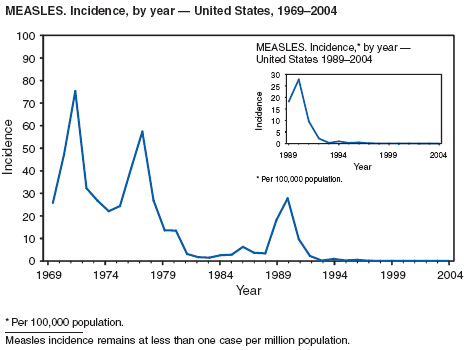 Papania M, Hinman A, Katz S, Orenstein W, McCauley M, eds. Progress toward measles elimination---absence of measles as an endemic disease in the United States. J Infect Dis 2004;189(Suppl 1):S1--257.