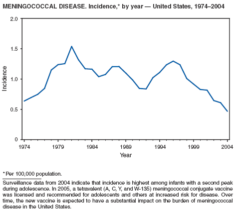 Rosenstein NE, Perkins BA, Stephens DS, et al. The changing epidemiology of meningococcal disease in the United States, 1992--1996. J Infect Dis 1999;180:1894--901.