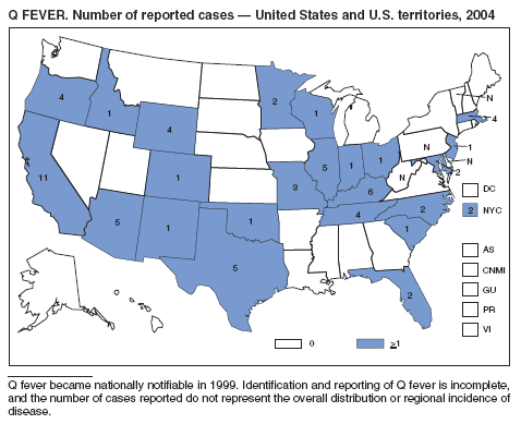 CDC. Q Fever---California, Georgia, Pennsylvania, and Tennessee, 2000--2001. MMWR 2002;41:924--7.