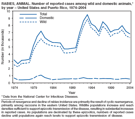 Krebs JW, Mandel EJ, Swerdlow DL, Rupprecht CE. Rabies surveillance in the United States during 2003. J Am Vet Med Assoc 2004;227:1912--25.