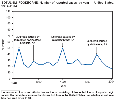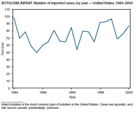 Botulism is a severe paralytic illness caused by the toxins of Clostridium botulinum. Exposure to toxin can occur by ingestion (foodborne botulism), in situ production from C. botulinum colonization of a wound (wound botulism) or the gastrointestinal tract (infant botulism), or by injection of pharmacologic preparations of toxin (treatment-associated botulism) (1). In 2004, cases were attributed to foodborne botulism, wound botulism, infant botulism, and treatment-associated botulism resulting from injection of an unlicensed concentrated preparation of toxin (2).