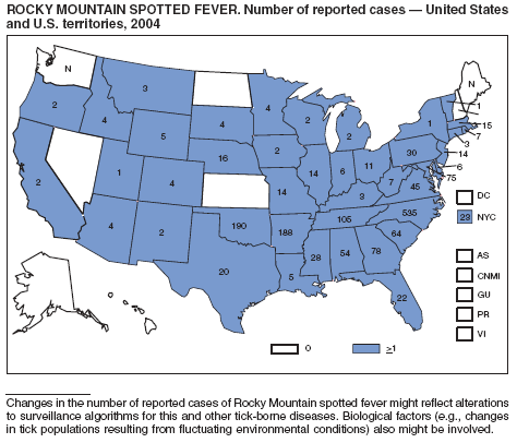 Dalton MJ, Clarke MJ, Holman RC, et al. National surveillance for Rocky Mountain spotted fever, 1981--1992: epidemiologic summary and evaluation of risk factors for fatal outcome. Am J Trop Med Hyg 1995;52:405--13.