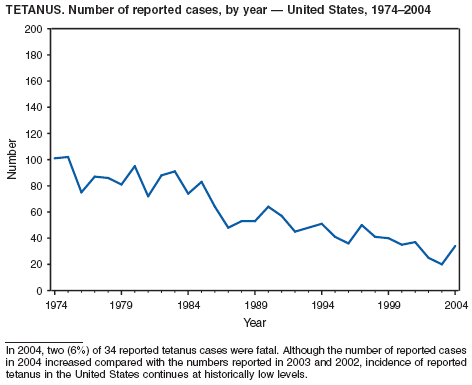 Pascual FB, McGinley EL, Zanardi LR, Cortese MM, Murphy TV. Tetanus surveillance---United States, 1998--2000. In: Surveillance Summaries, June 20, 2003. MMWR 2003;52(No. SS-3):1--8.
