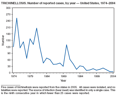 Moorhead A, Grunenwald PE, Dietz VJ, Schantz PM. Trichinellosis in the United States, 1991--1996: declining but not gone. Am J Trop Med Hyg 1999;60:66--9.