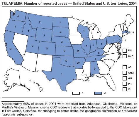 CDC. Tularemia---United States, 1990--2000. MMWR 2002;51:182--4.