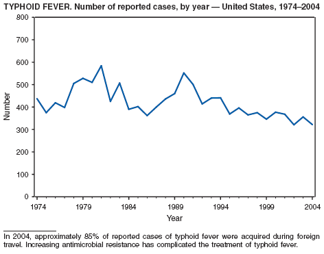 Olsen SJ, Bleasdale SC, Magnano AR, et al. Outbreaks of typhoid fever in the United States, 1960--1999. Epidemiol Infect 2003;130:13--21.