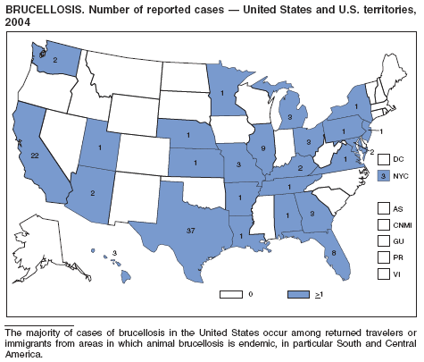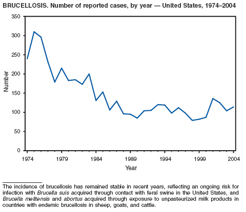 In 2004, five cattle herds in three states were reported by the U.S. Department of Agriculture to be affected by brucellosis. No human cases of brucellosis were associated with the affected herds. One affected state was able to maintain its brucellosis-free designation, and 48 states remain designated free of cattle brucellosis by the U. S. Department of Agriculture (1). Brucella abortus remains enzootic in elk and bison in the greater Yellowstone National Park area, and Brucella suis is enzootic in feral swine in the southeast. Hunters exposed to these animals might be at increased risk for infection. The majority of human cases in the United States occur among returned travelers or immigrants from countries with endemic brucellosis and are associated with consumption of unpasteurized milk or soft cheeses. Pathogenic Brucella species are considered category B biologic threat agents because of a high potential for aerosol transmission. For the same reason, biosafety level 3 practices, containment and equipment are recommended for laboratory manipulations of isolates.