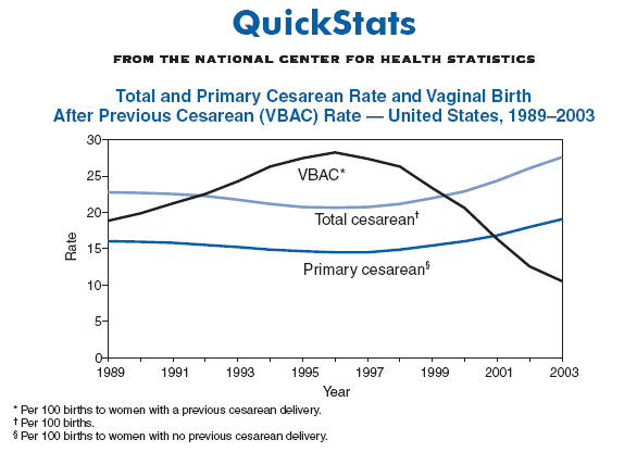 Preliminary data for 2003 indicated that 27.6% of all births in the United States resulted from cesarean deliveries, an increase of 6% from 2002 and the highest percentage ever reported in the United States. After declines during 1989--1996, the total cesarean rate and the primary cesarean rate (i.e., percentage of cesareans among women with no previous cesarean delivery; 19.1% in 2003) have increased each year. In addition, the rate of VBAC, which had increased during 1989--1996, decreased by 63% to 10.6% in 2003. Among women with previous cesarean deliveries, the likelihood that subsequent deliveries would be cesarean was approximately 90% in 2003. SOURCE: National Vital Statistics System, annual files, 1989--2003. Available at http://www.cdc.gov/nchs/births.htm.