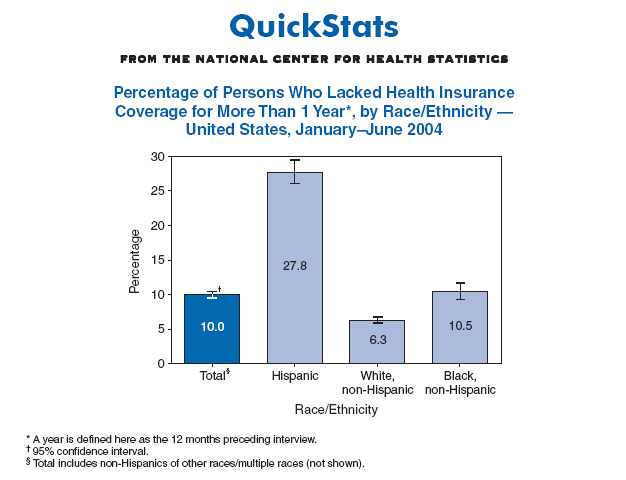 During January--June 2004, 10% of persons of all ages and approximately 28% of Hispanics had been without health insurance coverage for more than 1 year. Hispanics were more than four times as likely as non-Hispanic whites and approximately 2.5 times as likely as non-Hispanic blacks to have been uninsured for more than 1 year. SOURCE: Cohen RA, Hao C, Coriaty Nelson Z. Health insurance coverage: estimates from the National Health Interview Survey, January--June 2004. Available at http://www.cdc.gov/nchs/data/nhis/earlyrelease/insur200412.pdf.