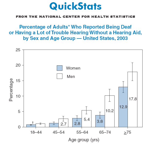 group, more men than women reported hearing limitations; among persons aged 65--74 years, men were more than twice as likely as women to have hearing limitations.
