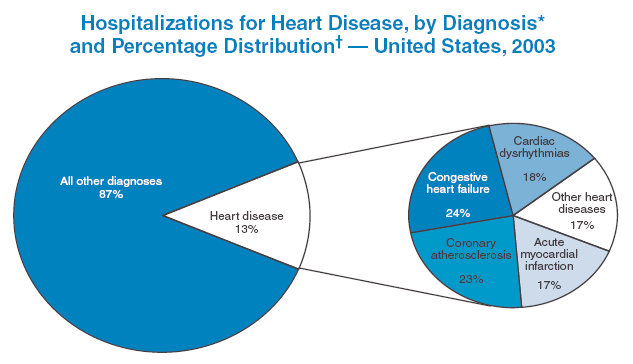 * International Classification of Diseases, Ninth Revision, Clinical Modification (ICD-9-CM) codes 391--392.0, 393-398, 402, 404, 410--416, and 420--429. Percentages do not add to 100% because of rounding. In 2003, 13% of all hospital discharges were for heart disease, one of the leading causes of hospitalization. Of these, 24% were for congestive heart failure, 23% for coronary atherosclerosis,18% for cardiac dysrhythmias, 17% for acute myocardial infarction, and 17% for other heart diseases (e.g., valve disorders and hypertensive heart disease). SOURCE: DeFrances CJ, Hall MJ, Podgornik MN. 2003 National Hospital Discharge Survey. Advance data from vital and health statistics, no. 359. Hyattsville, MD: US Department of Health and Human Services, CDC, National Center for Health Statistics; 2005. Available at http://www.cdc.gov/nchs/data/ad/ad359.pdf.