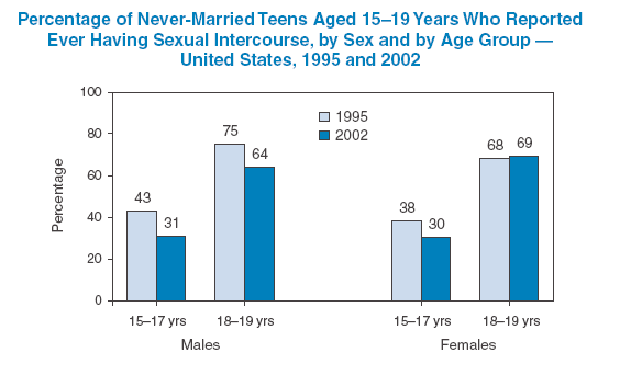 SOURCES: 1995 and 2002 National Survey of Family Growth; 1995 National Survey of Adolescent Males; and Abma JC, Martinez GM, Mosher WD, Dawson BS. Teenagers in the United States: sexual activity, contraceptive use, and childbearing, 2002. Vital Health Stat 2004;23(24). Available at