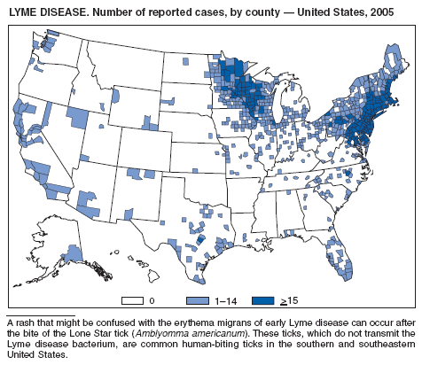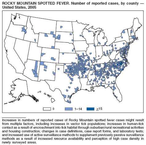 Chapman AS, Murphy SM, Demma LJ, et al. Rocky Mountain spotted fever in the United States, 1997--2002. Vector Borne Zoonotic Dis 2006;6:170--8.
