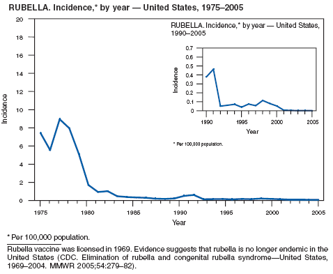Reef SE, Frey TK, Theall K, et al. The changing epidemiology of rubella in the 1990s: on the verge of elimination and new challenges for control and prevention. JAMA 2002;287;464--72.