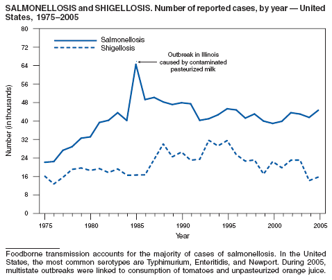 Olsen SJ, Bishop R, Brenner FW, et al. The changing epidemiology of Salmonella: trends in serotypes isolated from humans in the United States, 1987--1997. J Infect Dis 2001;183:756--61.