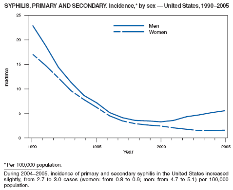 CDC. Primary and secondary syphilis---United States, 2003--2004. MMWR 2006;55:269--73.