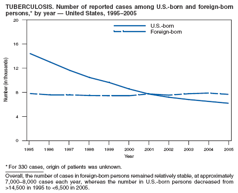 Talbot EA, Moore M, McCray E, Binkin NJ. Tuberculosis among foreign-born persons in the United States, 1993--1998. JAMA 2000;284:2894--900.