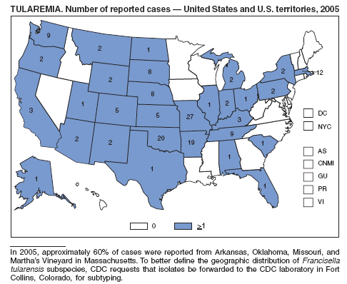 CDC. Tularemia---United States, 1990--2000. MMWR 2002;51:182--4.