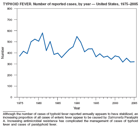 Olsen SJ, Bleasdale SC, Magnano AR, et al. Outbreaks of typhoid fever in the United States, 1960--1999. Epidemiol Infect 2003;130:13--21.