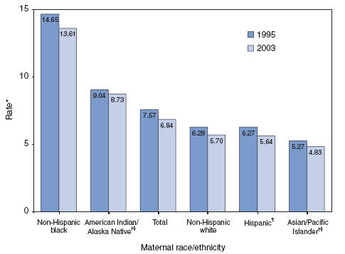 * Deaths of infants aged <1 year per 1,000 live births. Includes persons of Hispanic and non-Hispanic origin. § Difference not significant at p<0.05 (z test). ¶ Persons of Hispanic origin might be of any race. Infant mortality rates decreased significantly (p<0.05, z test) in the United States from 1995 to 2003. The rate for non-Hispanic black mothers was significantly higher than for all other groups for both years; the rate for American Indian/Alaska Native mothers was significantly higher than for non-Hispanic whites, Hispanics, and Asians/Pacific Islanders for both years. SOURCE: Mathews TJ, MacDorman MF. Infant mortality statistics from the 2003 period linked birth/infant death data set. Natl Vital Stat Rep 2006;54(15).