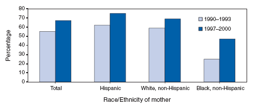 Persons using assistive technology might not be able to fully access information in this file. For assistance, please send e-mail to: mmwrq@cdc.gov. Type 508 Accommodation and the title of the report in the subject line of e-mail. QuickStats: Percentage of Infants Born During 1990--1993 and 1997--2000 Who Were Ever Breastfed, by Race/Ethnicity of Mother --- United States