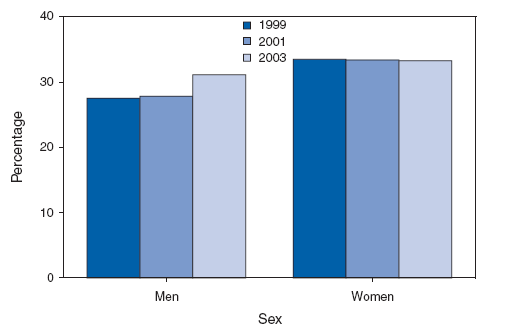 From 1999--2000 through 2003--2004, the prevalence of obesity among men increased significantly from 27.5% to 31.1%. During the same period, no significant change occurred among women, 33.2% of whom were obese in 2003--2004. Additional information regarding NHANES is available at http://www.cdc.gov/nchs/nhanes.htm. SOURCE: Ogden CL, Carroll MD, Curtin LR, McDowell MA, Tabak CJ, Flegal KM. Prevalence of overweight and obesity in the United States, 1999--2004. JAMA 2006;295:1549--55.
