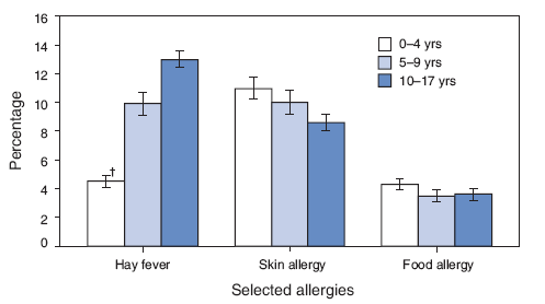 During 2003--2005, the percentage of children with hay fever increased with age; children aged 10--17 years were nearly three times as likely to have hay fever than children aged 0--4 years. In contrast, the percentage of children with skin allergies decreased with age, and the percentage of children with food allergies did not vary with age. SOURCE: Health data for all ages. National Health Interview Survey, 2003--2005. Hyattsville, MD: US Department of Health and Human Services, CDC. Available at http://209.217.72.34/hdaa/tableviewer/tableview.aspx?reportId=186.