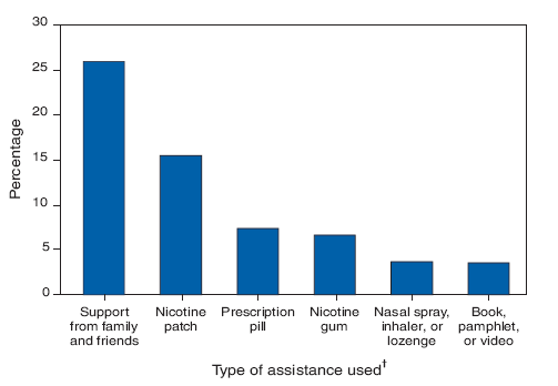 Although many types of assistance to quit smoking are available, support from family and friends (25.9%) and nicotine patches (15.5%) were the most commonly used types in 2005. Other types used less frequently were prescription pills (7.4%); nicotine gum (6.7%); nasal sprays, inhalers, or lozenges (3.7%); and books, pamphlets, or videos (3.6%). SOURCE: National Health Interview Survey, 2005. Available at http://www.cdc.gov/nchs/nhis.htm.