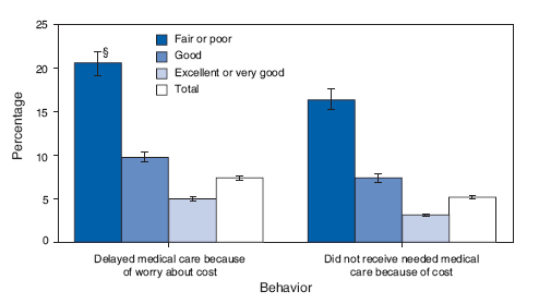 * Estimates are age adjusted using the 2000 projected U.S. population as the standard population and using five age groups: 0--11 years, 12--17 years, 18--44 years, 45--64 years, and >65 years. Estimates are based on household interviews of a sample of the civilian, noninstitutionalized U.S. population. Based on responses to the following questions: "During the past 12 months, has [person] delayed seeking medical care because of worry about the cost?" and "During the past 12 months was there any time when [person] needed medical care but did not get it because [person] could not afford it?" Both questions exclude dental care. Respondents were asked to answer regarding themselves and other family members living in the same household. Health status data were obtained by asking respondents to assess their own health and that of family members living in the same household as excellent, very good, good, fair, or poor. § 95% confidence interval.