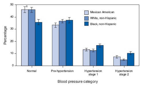 Blood pressure category varied substantially by race/ethnicity. Mexican Americans and non-Hispanic whites were more likely to have normal blood pressure compared with non-Hispanic blacks. Conversely, higher percentages of non-Hispanic blacks had hypertension stage 1 and hypertension stage 2 compared with non-Hispanic whites and Mexican Americans. SOURCE: National Health and Nutrition Examination Survey 1999--2004. Available at http://www.cdc.gov/nchs/nhanes.htm.