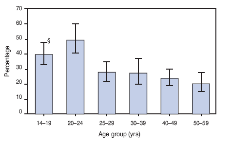 Persons using assistive technology might not be able to fully access information in this file. For assistance, please send e-mail to: mmwrq@cdc.gov. Type 508 Accommodation and the title of the report in the subject line of e-mail. QuickStats: Prevalence of HPV* Infection Among Sexually Active Females Aged 14--59 Years, by Age Group --- National Health and Nutrition Examination Survey, United States, 2003--2004