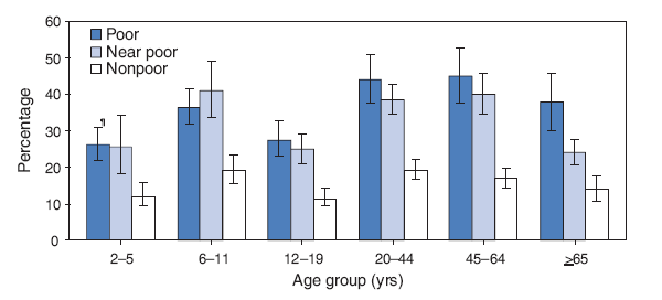 * As determined by NHANES dental examination; excludes persons who are edentulous. Persons aged 2--5 years: primary teeth only; 6--11 years: both primary and secondary teeth; >12 years: secondary teeth only. § Poor is defined as having an annual family income <100% of the relevant U.S. Census poverty threshold, near poor as 100% to <200% of the threshold, and nonpoor as >200% of the threshold. In 2004, for a family of four (two adults and two children aged <18 years), the poverty threshold was $19,157, and poverty status levels were as follows: poor, <$19,157; near poor, $19,157--$38,314; and nonpoor, >$38,314. ¶ 95% confidence interval. During 2001--2004, poor persons were at least twice as likely as nonpoor persons to have untreated dental caries, regardless of age group. In each age group, persons categorized as near poor also were more likely than nonpoor persons to have untreated caries. SOURCE: CDC. Health data for all ages. National Health and Nutrition Examination Survey, 2001--2004. Available at http://www.cdc.gov/nchs/health_data_for_all_ages.htm.