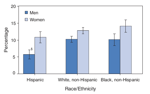 In 2006, among Hispanic, non-Hispanic black, and non-Hispanic white adults, women were more likely than men to have asthma. Overall, Hispanics were less likely than non-Hispanic whites and non-Hispanic blacks to have asthma. SOURCE: National Health Interview Survey, 2006. Information available at http://www.cdc.gov/nchs/nhis.htm.