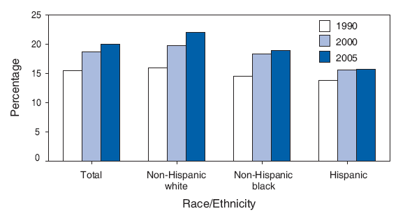 Since 1989, data on weight gain of women during pregnancy have been collected on U.S. birth certificates. Weight gain of >40 pounds during pregnancy is not recommended for women having a singleton birth, regardless of the woman's height and prepregnancy weight. Excessive weight gain is associated with greater risk for gestational diabetes, preeclampsia, and other adverse conditions during pregnancy and complications of delivery for both mother and infant. From 1990 to 2005, the percentage of women overall who gained >40 pounds increased from 15% to 20%; the percentage who gained >40 pounds also increased among non-Hispanic white, non-Hispanic black, and Hispanic women. Non-Hispanic white women were more likely than non-Hispanic black and Hispanic women to gain >40 pounds during pregnancy in 1990, 2000, and 2005. SOURCES: National Vital Statistics System. Annual natality files. Available at http://www.cdc.gov/nchs/vitalstats.htm. Martin JA, Hamilton BE, Sutton PD, et al. Births: final data for 2005. Natl Vital Stat Rep 2007;56(6). Available at http://www.cdc.gov/nchs/data/nvsr/nvsr56/nvsr56_06.pdf.