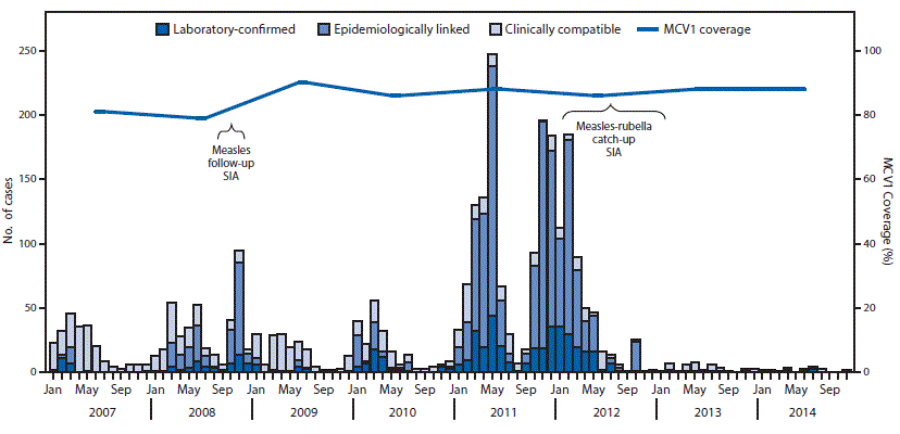 During 2007–2014, two nationwide SIAs were conducted in phases. The first SIA, in 2008, used monovalent measles vaccine, reached 3.9 million children aged 9 months–4 years (971,470 and 2,932,045 during the first and second phases, respectively), and achieved 93% administrative coverage (Figure). The second nationwide SIA, conducted during 2012–2013, used MR vaccine, reached 9.7 million children aged 9 months–14 years (1,843,087; 2,203,863; and 5,638,149 during the first, second, and third phases, respectively), and achieved 100% administrative coverage.
