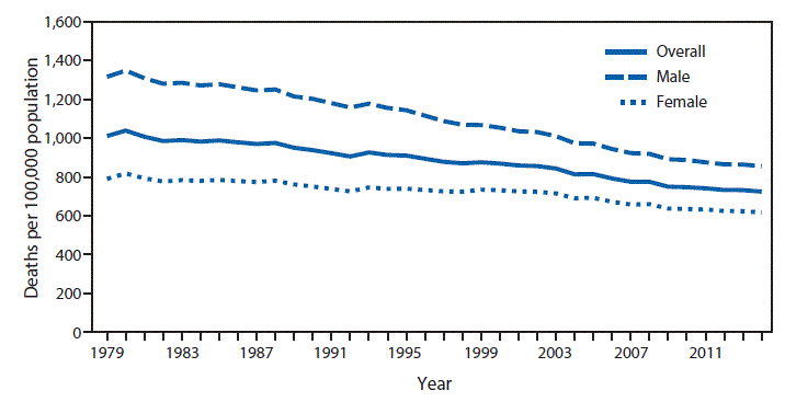 The age-adjusted death rate for the United States declined from 1,010.6 deaths per 100,000 population in 1979 to 724.6 per 100,000 population in 2014, the lowest rate ever recorded. Over the same period, rates for females declined 21.9% from 789.9 to 616.7, while rates for males declined 35.0% from 1,316.2 to 855.1, thus narrowing the mortality gap between males and females.