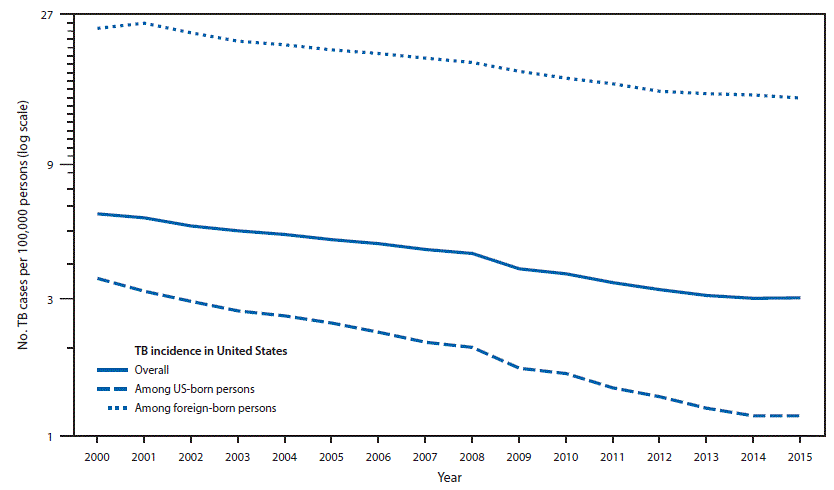 Preliminary data for 2015 indicate an incidence of 3.0 cases per 100,000 persons, approximately the same incidence as during 2013 and 2014. After 2 decades of declining incidence, progress toward TB elimination in the United States appears to have stalled.