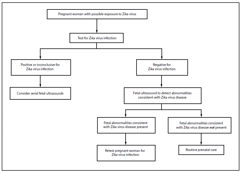 Pregnant women who had possible exposure to Zika virus who do not reside in an area with active transmission should be evaluated for Zika virus infection and tested in accordance with CDC Updated Interim Guidance (Figure 1). Similarly, pregnant women who reside in an area with active Zika virus transmission should be evaluated and tested in accordance with CDC interim guidance (Figure 2); a decision to implement testing of asymptomatic pregnant women should be made by local health officials based on information about levels of Zika virus transmission and laboratory capacity. A negative immunoglobulin M test result obtained 2–12 weeks after known exposure would suggest that a recent Zika virus infection did not occur and could obviate the need for serial ultrasounds.